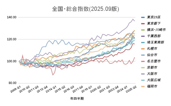 横浜市・川崎市の総合指数は東京23区と比較すると変動が小さいものの、全エリアで長期的には上昇トレンドを維持しています。