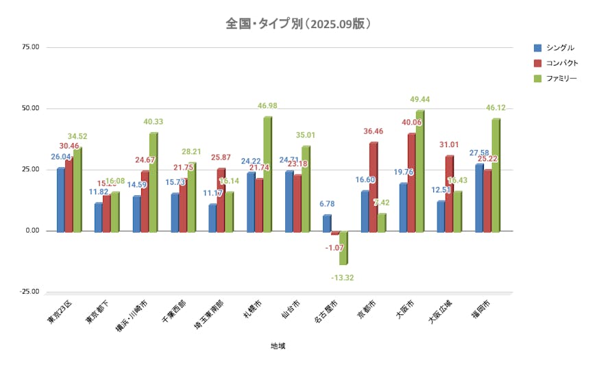 「ファミリー > コンパクト > シングル」の順で上昇率が高い点は全国同様となっています。