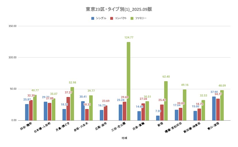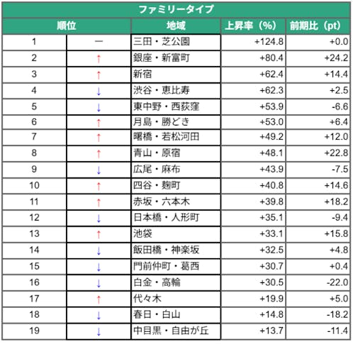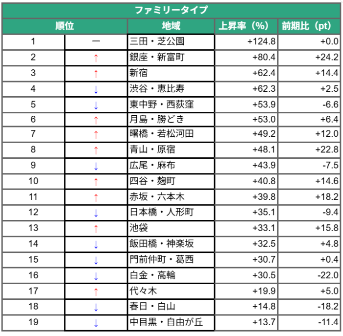 上位陣と下位陣の差が激しいファミリータイプでは「三田・芝公園」が首位をキープしています。上昇率は脅威の124.8%であり、リーマン・ショック後の2009年対比で倍増以上となります。