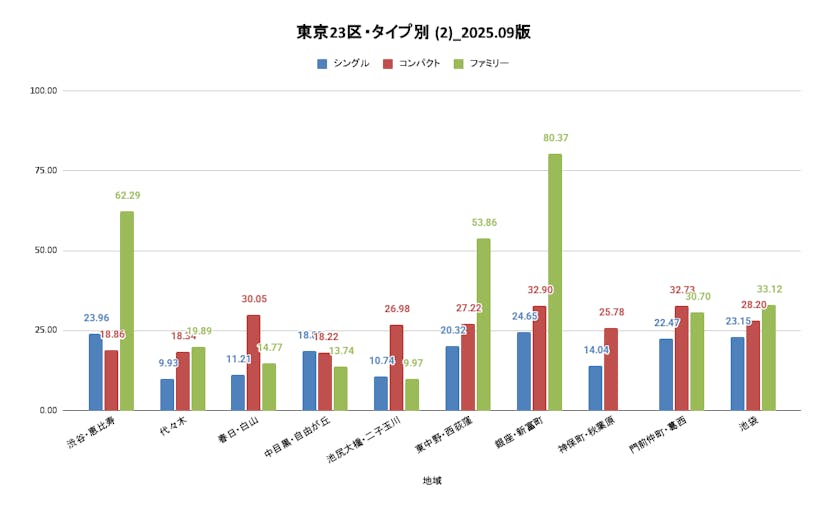 最後に、以下が東京23区各エリアの直近値を改めて切り出したグラフです。