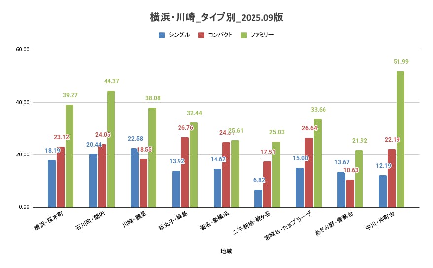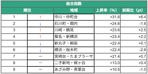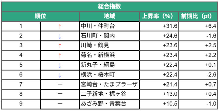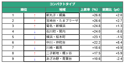 東京23区同様、横浜市・川崎市でもコンパクトタイプは全体的にシングルタイプよりも上昇率が大きくなっています。上位6位までで上昇率は20%を超えています。