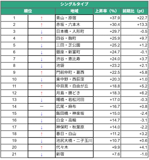 シングルタイプでは「青山・原宿」が首位を記録しました。前期比+22.7ptを記録し、前回順位15位から大きくランクアップしました。