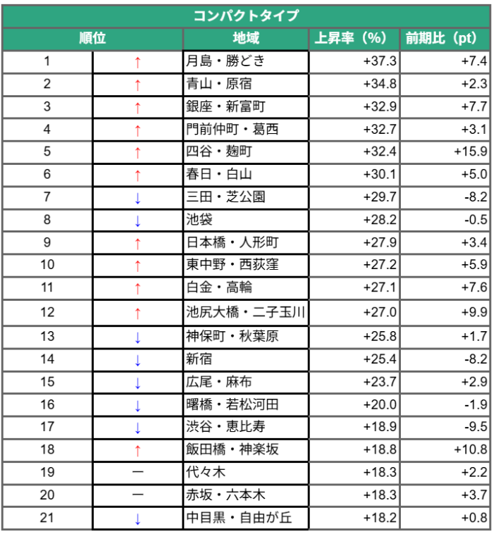 シングルタイプでは上昇率が振るわなかった「月島・勝どき」ですが、コンパクトタイプでは前期比+7.4ptと大きく上昇、首位を記録しています。
