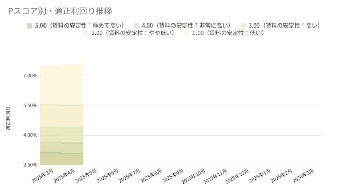 先月と比べて、利回りについてスコア1は上昇しましたが、スコア5は下落しており、物件によって二極化が進んでいる傾向が見て取れました。