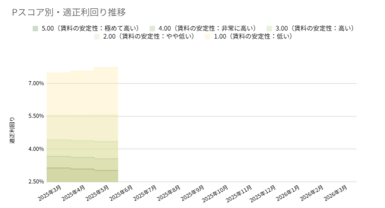 刷新されたPスコアは、1.00〜5.00までの点数で表され、点数が高い方がリスクが低い、つまり将来価格下落リスクが小さく、賃料が安定的に入ってくる物件であることを示します。