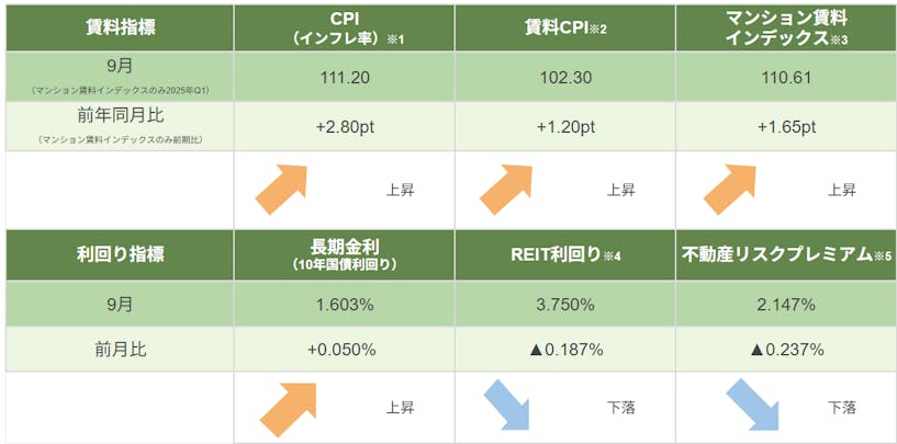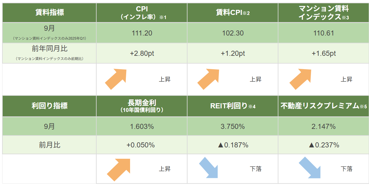 キャップレートは、長期国債利回りに代表されるリスクフリーレートと不動産リスク・プレミアムで構成されます。8月の長期国債の利回りは約0.05%上昇し、住宅系REITの配当利回りは0.187%下落したため、不動産リスク・プレミアムは前月比0.237%下落となりました。結果としてキャップレートは先月から引き続き5か月連続で下落し、不動産価格は上昇傾向にあります。