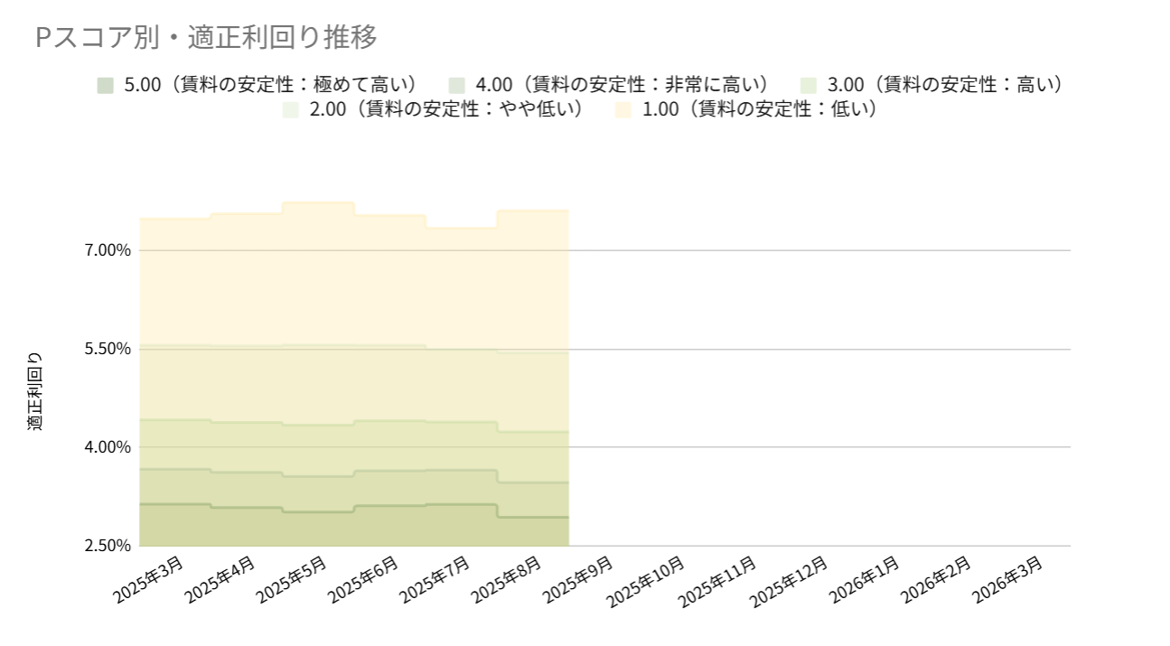 刷新されたPスコアは、1.00〜5.00までの点数で表され、点数が高い方がリスクが低い、つまり将来価格下落リスクが小さく、賃料が安定的に入ってくる物件であることを示します。