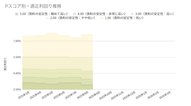 利回りについてスコア1は上昇しましたが、スコア5は下落しております。先月までとは逆に、物件によって二極化傾向が進んでいます。