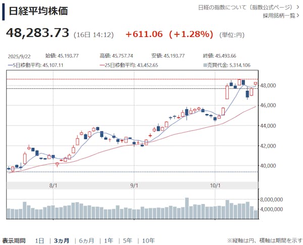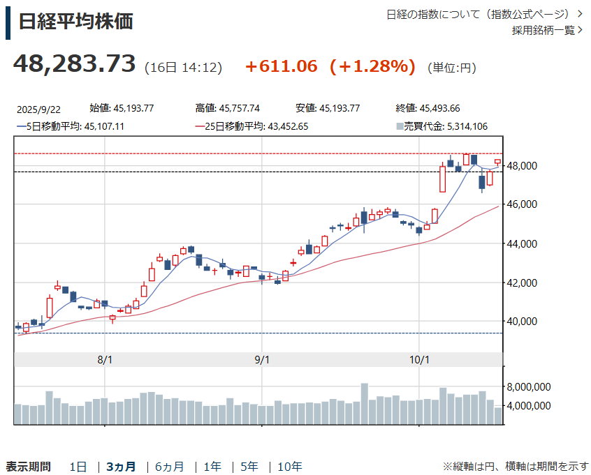 米国では連邦政府が1日から一部機関が閉鎖し、雇用統計などの経済指標の公表が止まっています。米連邦準備理事会(FRB)による量的引き締め(QT)終了が近いとの思惑や10月28〜29日の米連邦公開市場委員会(FOMC)での追加利下げ期待も改めて意識されています。日本では今月4日の自民党新総裁では高市早苗氏が選出されました。同氏は「安倍政治の継承」「改憲」「タカ派的経済安全保障」を掲げ、連立拡大にも意欲を示しています。高市新総裁誕生によるサプライズと、積極的な追加財政・金融緩和路線への期待から、日経平均は48,000円台へと上昇しました。さらに、米国株高や世界的なAI投資ブーム、国内企業業績の回復期待も重なり、複合的な要因で日経平均は歴史的高値をつけています。ただ米中の貿易摩擦が再燃するとの警戒感や公明党が自民党との連立政権から離脱し政局不透明感が高まっていることにも注意が必要です。