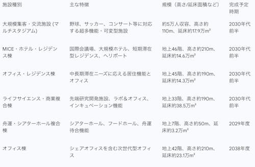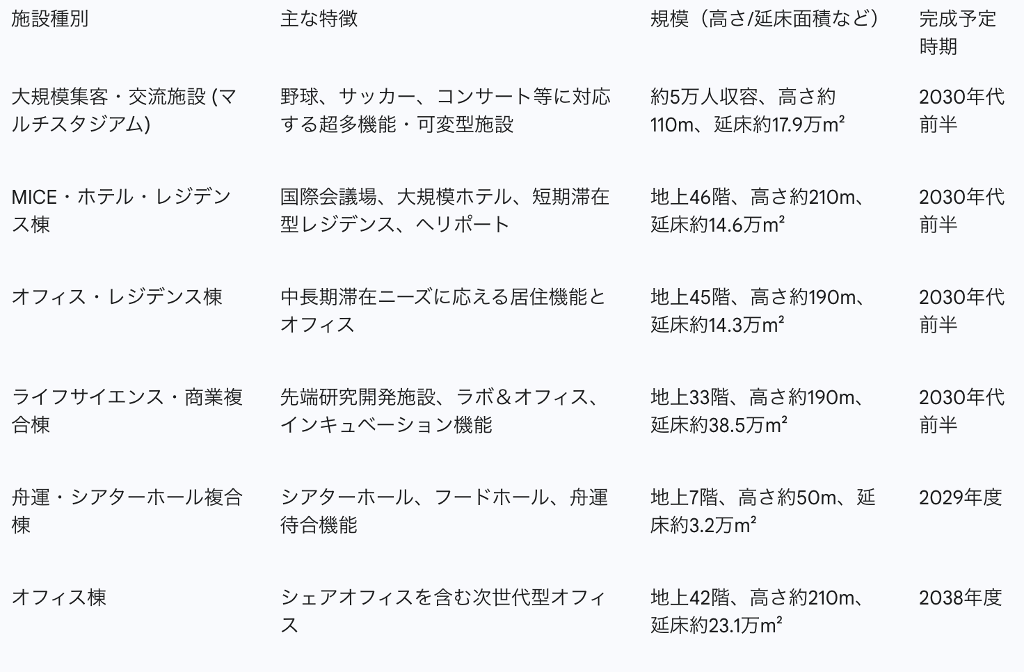 プロジェクトのタイムラインに内在する「交通インフラのギャップ」が、段階的な投資機会を生み出します。主要施設の多くが2032年頃に開業する一方、臨海地下鉄の開通は2040年頃とされており、この約8年間のギャップは、エリアの価値上昇が三段階の波となって現れることを示唆しています。