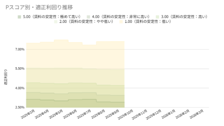 刷新されたPスコアは、1.00〜5.00までの点数で表され、点数が高い方がリスクが低い、つまり将来価格下落リスクが小さく、賃料が安定的に入ってくる物件であることを示します。