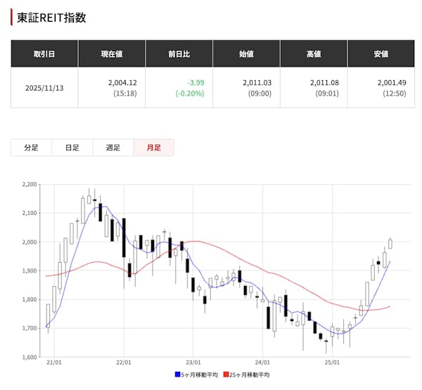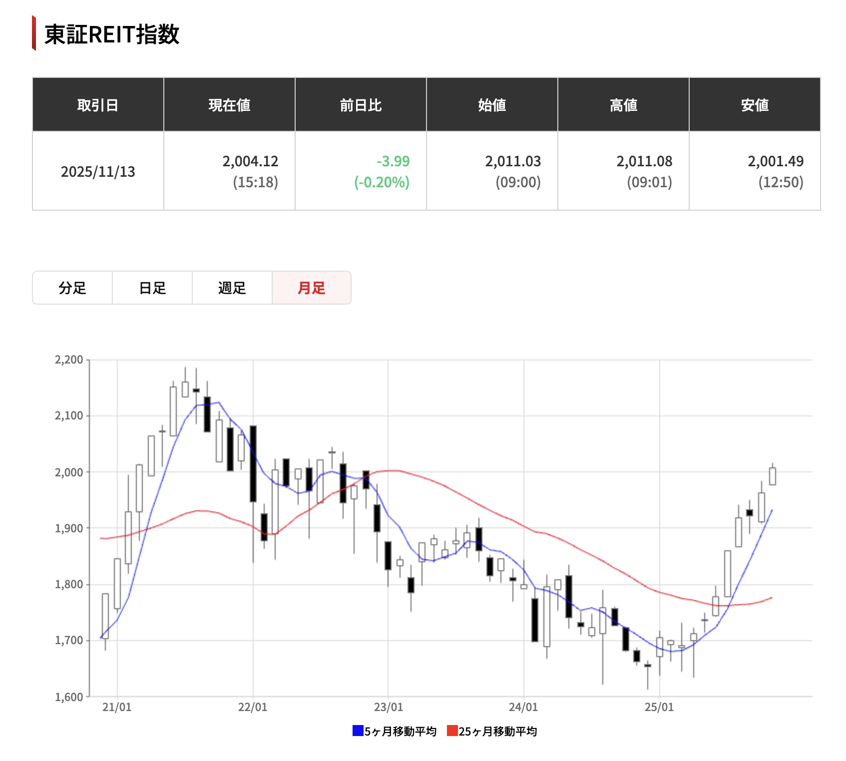 10月初めの東証REIT指数は1900台で始まりましたが、10月中旬以降はじわじわと上昇し、11月上旬には2,000をやや下回る水準で推移しています。