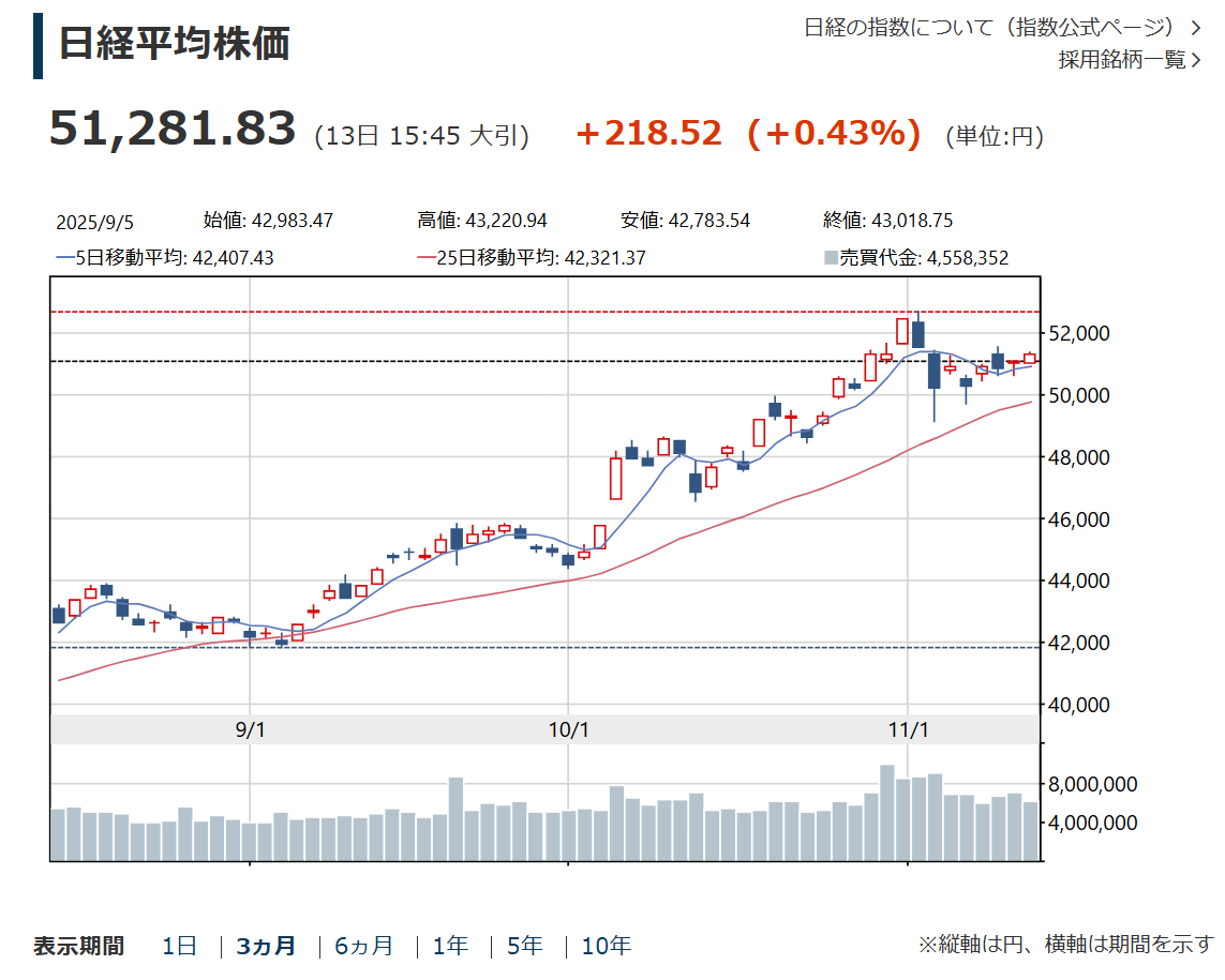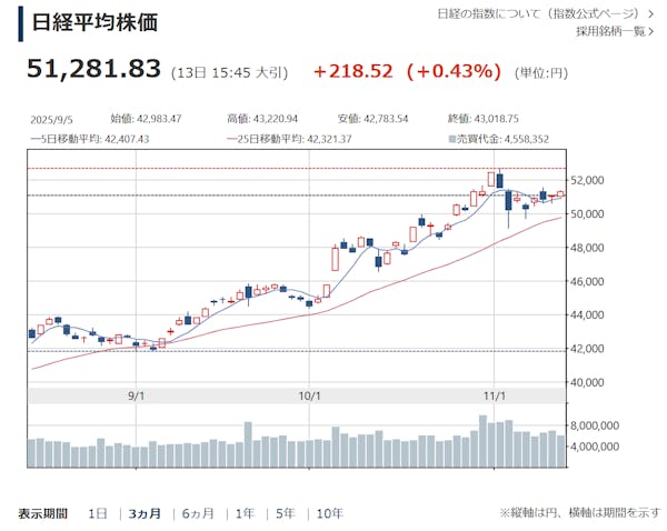 ドル円相場は154円台前半前後で推移しています。一方、日経平均株価は史上初めて5万円の大台を突破し、その勢いのまま10月末に52,000円台へ乗せました。過熱感も指摘されますが、上昇トレンドは依然として健在です。