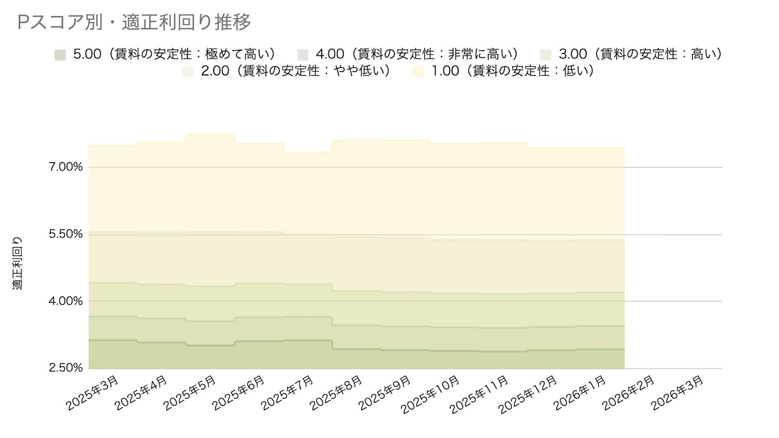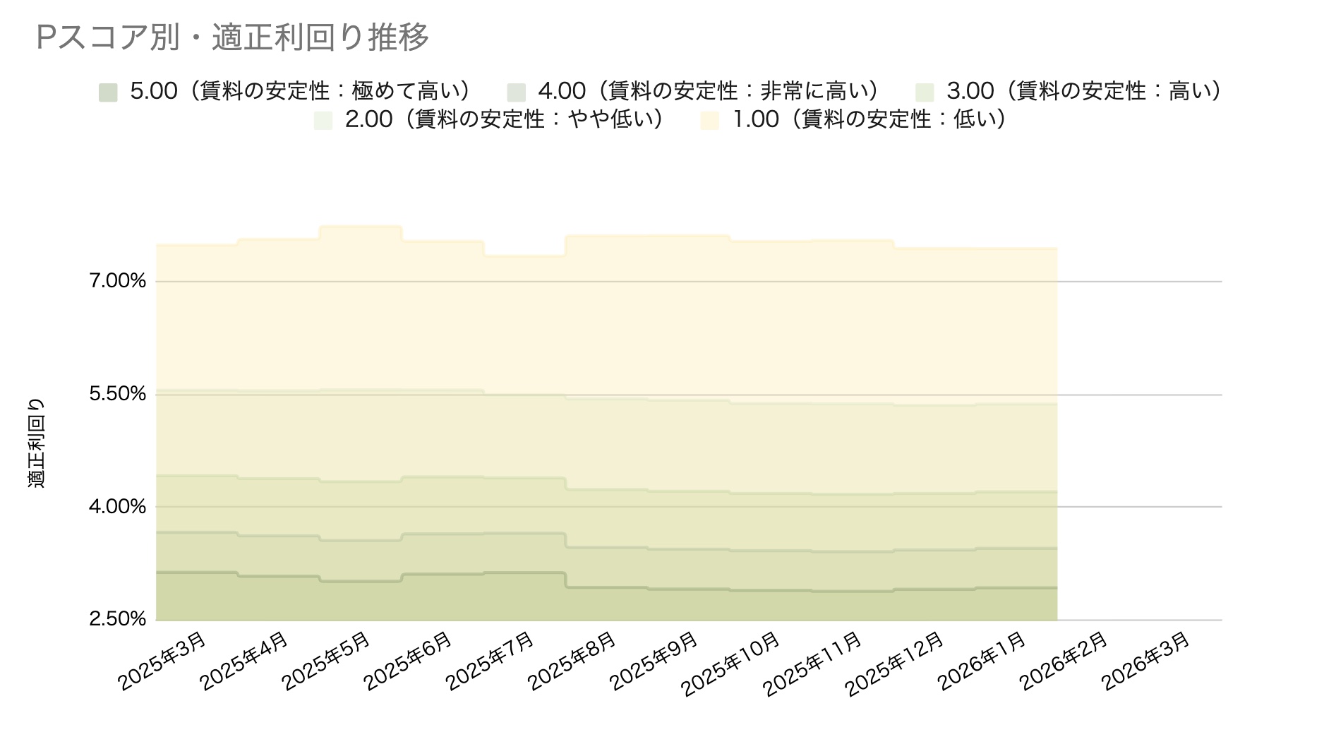 刷新されたPスコアは、1.00〜5.00までの点数で表され、点数が高い方がリスクが低い、つまり将来価格下落リスクが小さく、賃料が安定的に入ってくる物件であることを示します。利回りについてはスコア2〜5に関して上昇しています。リスクが低い物件の適正利回りが上昇していることが確認できます。
