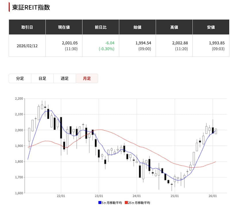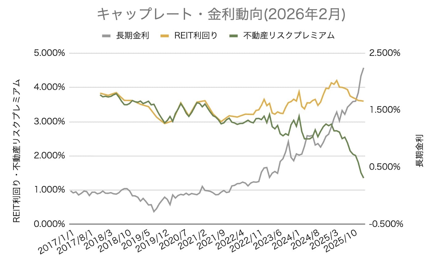 総選挙での与党の圧勝を受けて、日経平均株価は終値で約57,000円台まで上昇、史上最高値を更新しました。単独過半数の議席確保により高市政権は今後「責任ある積極財政」を強力に推し進めると考えられます。一方、食料品の消費税を2年間実質ゼロとする公約を受けて長期金利が上昇するなど、財政規律の緩みを懸念した市場からの圧力も受けており、今後は市場の信任を得ながら政策を進める必要があります。しばらくは株高、債券安(金利高)、円安のトレンドが継続すると思われます。金利上昇は不動産マーケットにネガティブに作用するも、インフレによる賃料上昇の期待から強気な状況が継続、長期金利の上昇にもかかわらずREIT利回りは低下、不動産リスクプレミアムは大きく低下しています。フラット35の融資上限額引き上げ等の住宅ローン市場のサポートを受けて都心部実需物件の価格は当面堅調に推移するでしょう。