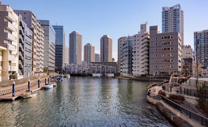 ※八丁堀から月島・湊エリアを臨む/右手背景はパークシティ中央湊ザタワー、シティタワー銀座東 (弊社カメラマン峰岸撮影)