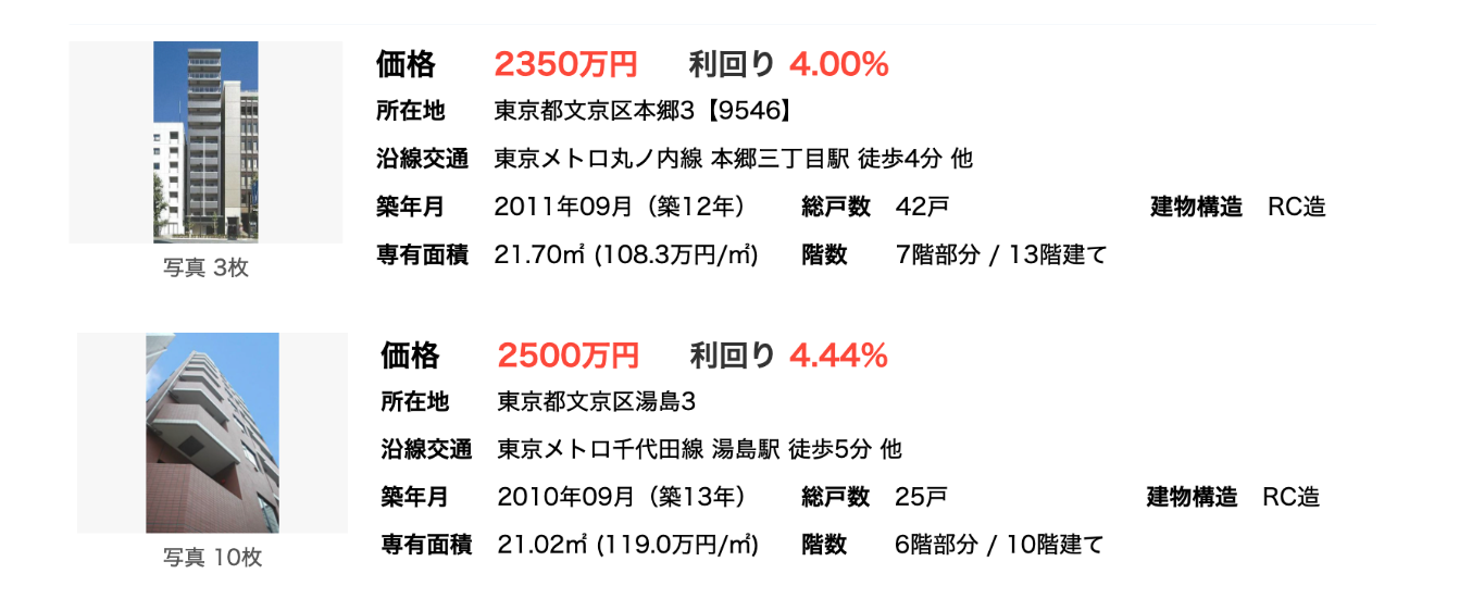 物件にもよるのですが、まず文京区は築10年以下の物件は197件中8件であり、更に築浅は少なくなります。その上で今回築12年、13年の物件を比較してみると、本郷三丁目物件の方が湯島駅物件よりも平米単価で10%ほど安い一方で、賃料がこの比較ですと16%ほど安いです。