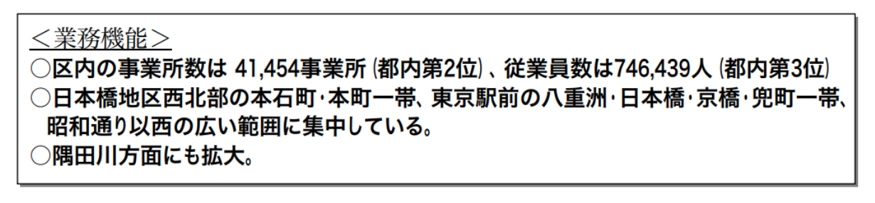 中央区は41,454事業所と都内第2位(1位は港区)で従業者数は746,439 人と都内第3位(1位は港区、2位は千代田区)