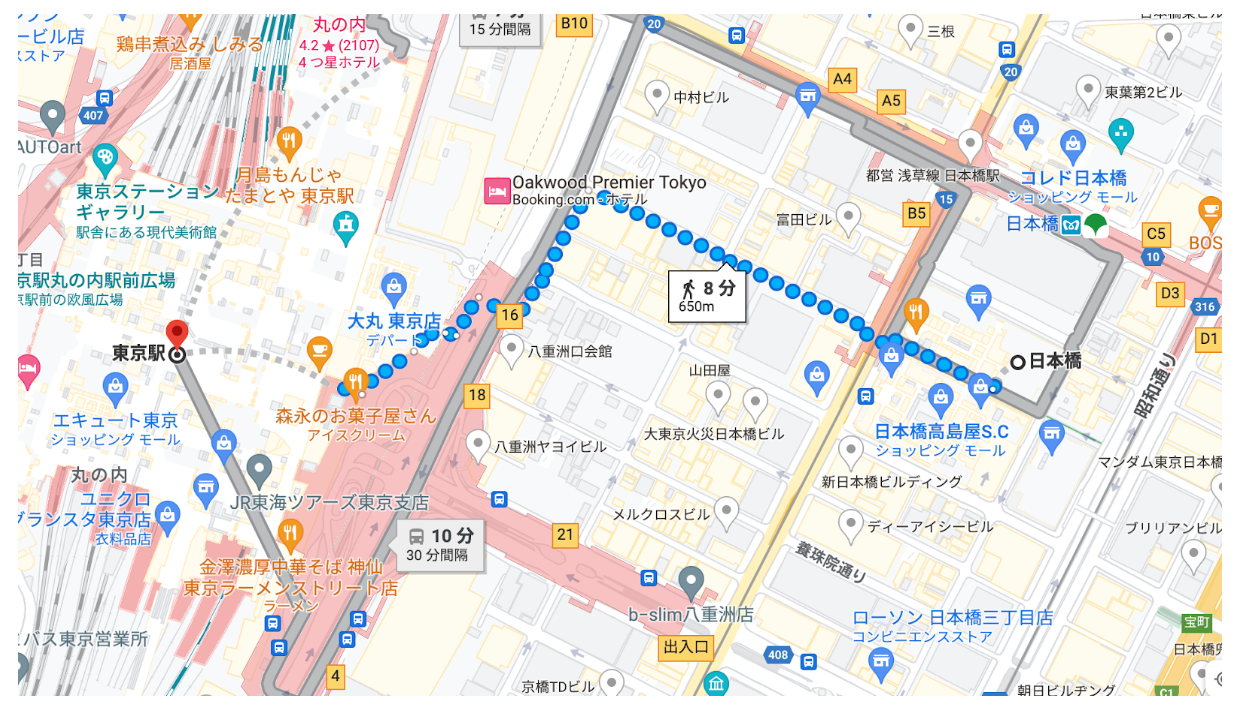東京駅から日本橋エリアに関しては徒歩圏内での移動が可能です。