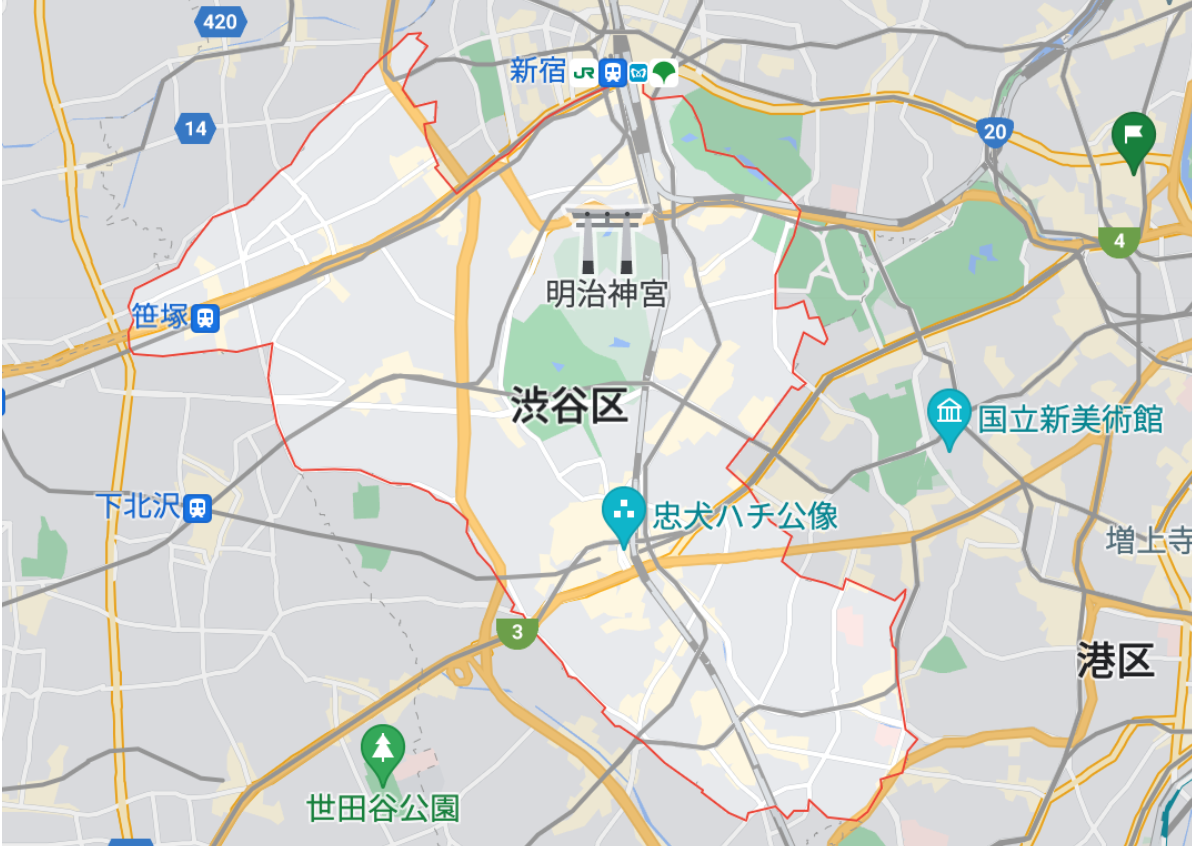 渋谷区と言うと、渋谷駅近辺を思い浮かべる方が多いでしょう。北は西新宿5丁目近辺、南は恵比寿・広尾と南北に長いことが特徴です。