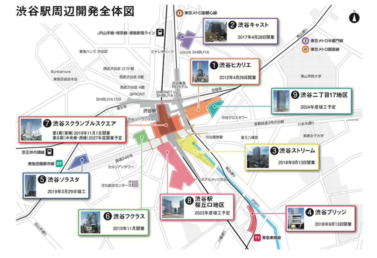 9つのうちすでに6つは開業済みですがまだ3つも再開発の案件が残っています。渋谷駅を中心に、原宿、表参道、青山、代官山、恵比寿といったそれぞれの「点(街)」から「面(エリア)」へと回遊性を高めるような開発を進め、各地域の魅力をつなげていくことを目的とされています。