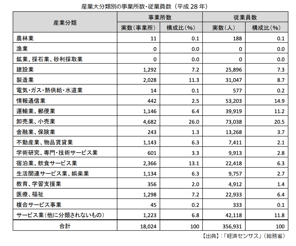 平成28年江東区は事業所数は18,024で従業者数は356,931 人です。江東区全体の事業所の特徴としては卸売業、小売業の割合が26%と多いことです。