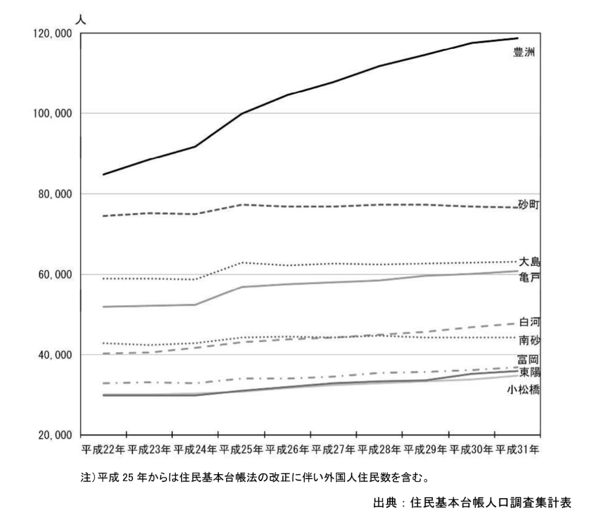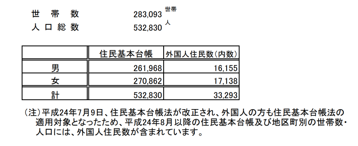 江東区のデータによると、2022年12月1日時点で532,830人です。2015年に50万人を突破しており、人口増加のトレンドが続いている区になります。