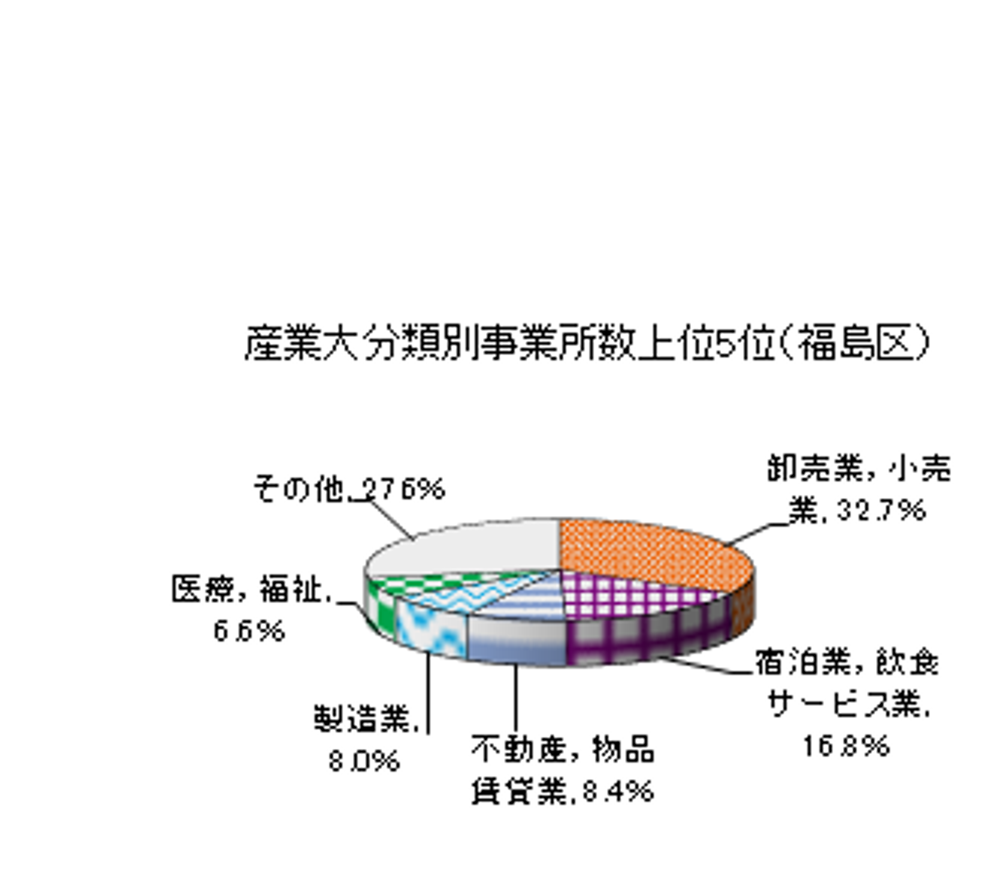 一例として福島区の事業所数、従業員数を確認してみましょう。事業所数は5,203事業所(大阪市全体の2.7%)、従業者数は6万4972人(同2.8%)となっています。(平成26年)