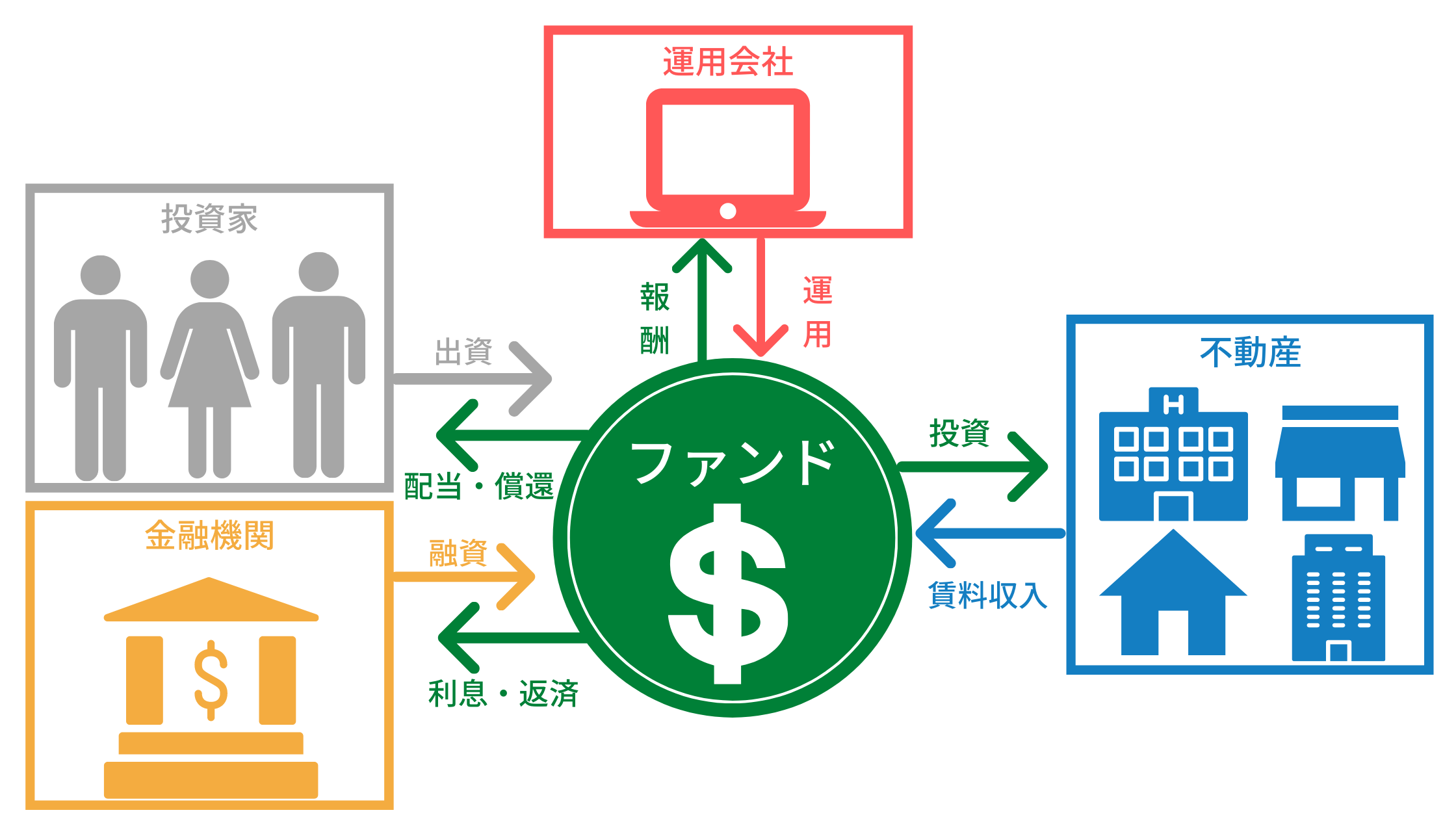 不動産投資ファンドとは、対象を不動産とした投資ファンドです。投資ファンドは、投資家からお金を集めて投資のプロが運用し、利益が出たらそれを投資家に分配するという仕組みで成り立っています。